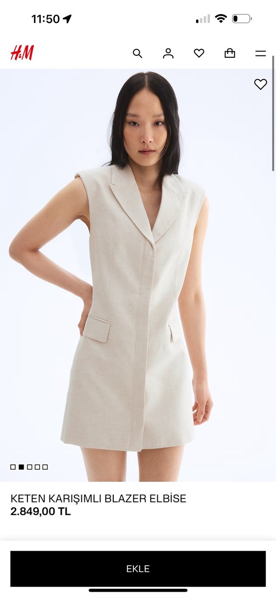 Bej renkli, kolsuz ve keten kumaştan midi uzunlukta yelek elbise Minimalist, çağdaş ve ofis stiline uygun, rahat kesim ve notched lapel yakaya sahiptir.