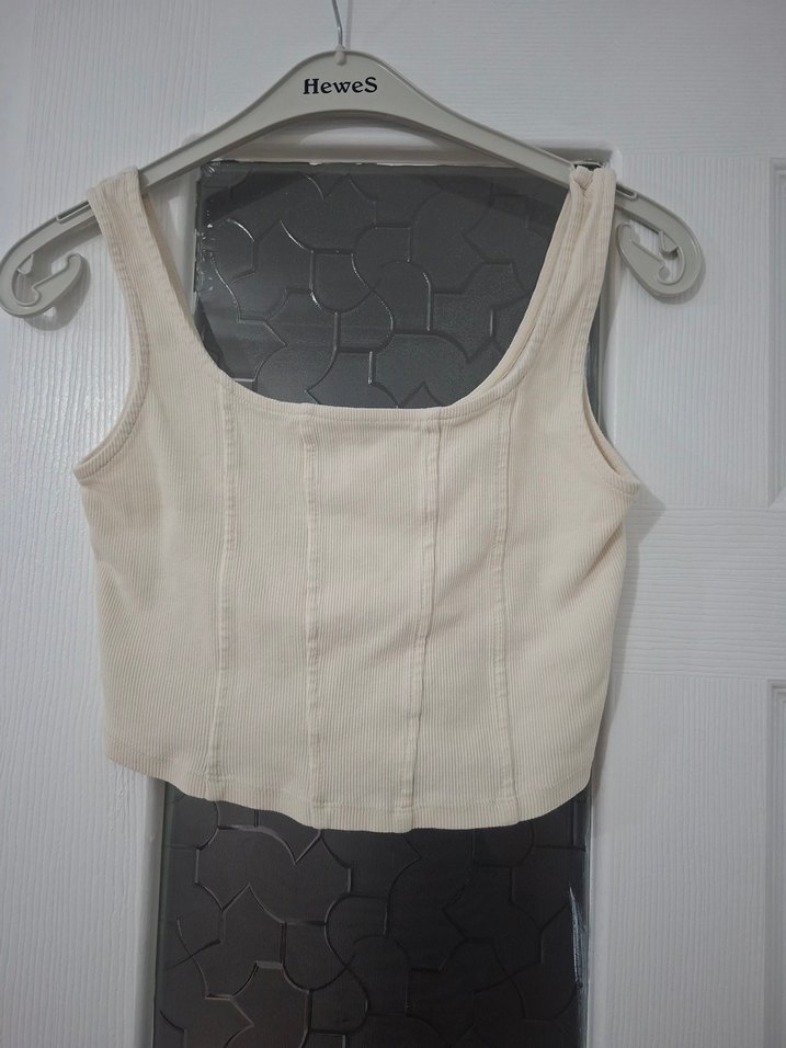 Bej renkte, kolsuz ve kısa kesim olan bu dar kesim büstiyer, desen içermeyen sade tasarımıyla günlük ve sokak stiline uygundur.
