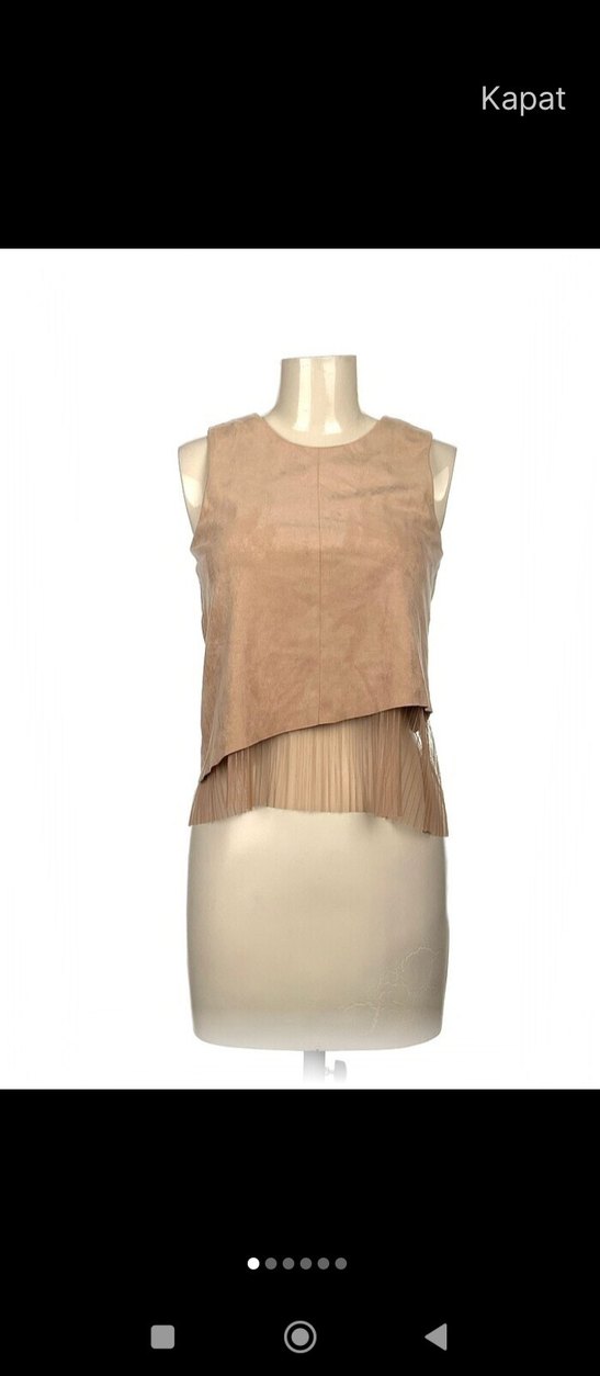 Bej renkte, kolsuz, süet dokulu, mini uzunlukta, bol kesim ve pilili detaylı çağdaş tarzda bluz.