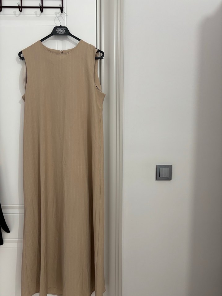 Bej renkli, kolsuz, uzun elbise. Drapeli tasarım ve yuvarlak yaka ile sade, günlük kullanıma uygun.