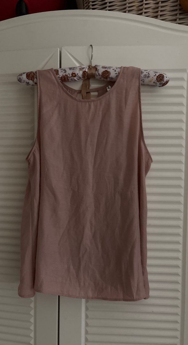 Bej renkli, kolsuz, yüksek yakalı keten bluz. Rahat ve dökümlü kesimiyle minimalist ve günlük şıklık sağlar.