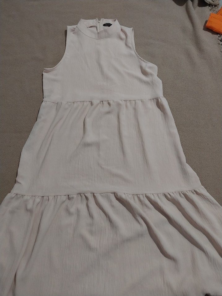 Bej renkli, kolsuz, yüksek yakalı ve bol kesim uzun keten elbise, fırfır detaylarıyla minimalist bohem tarz sunar. Rahat günlük kullanım için uygundur.
