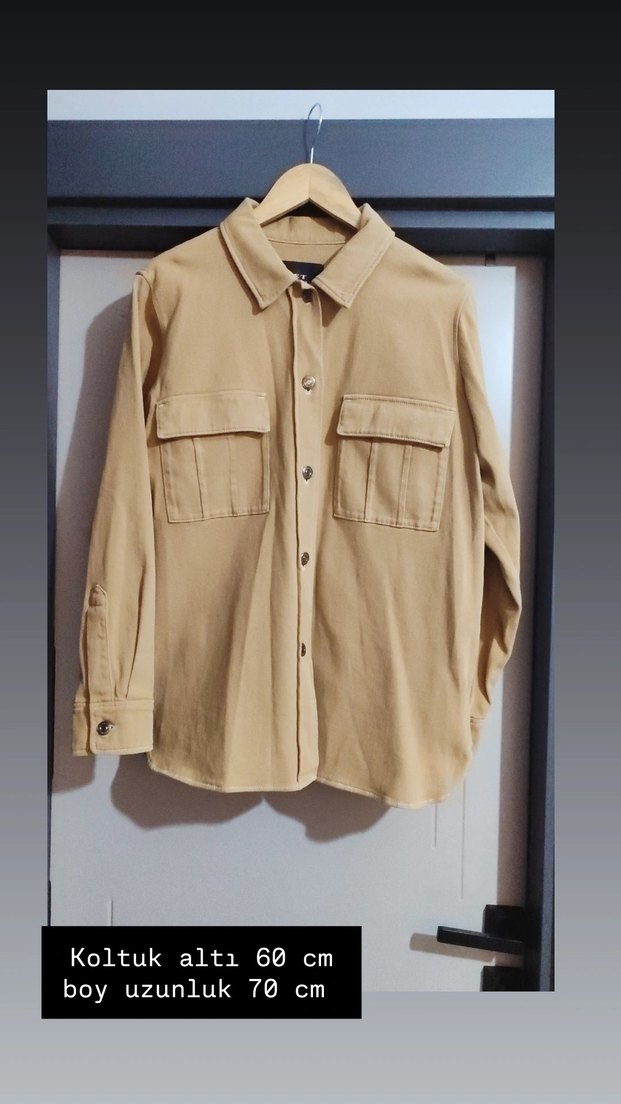 Bej kot kumaştan, düğmeli, uzun kollu ve çıtçıtlı iki cep detaylı kadın gömlek. Normal boyda ve rahat kesim, koltuk altı genişliği 60 cm.