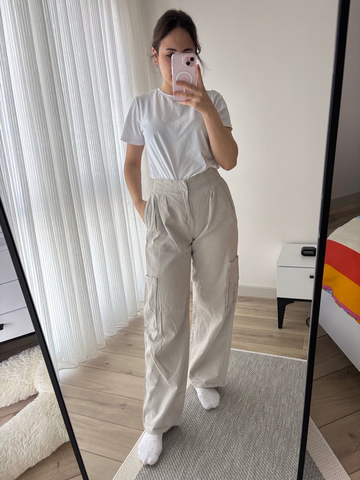 Bej kot kumaştan, rahat kesim pantolon. Desensiz tasarımıyla gündelik kullanıma uygun. Deformesi yoktur yeni gibi.