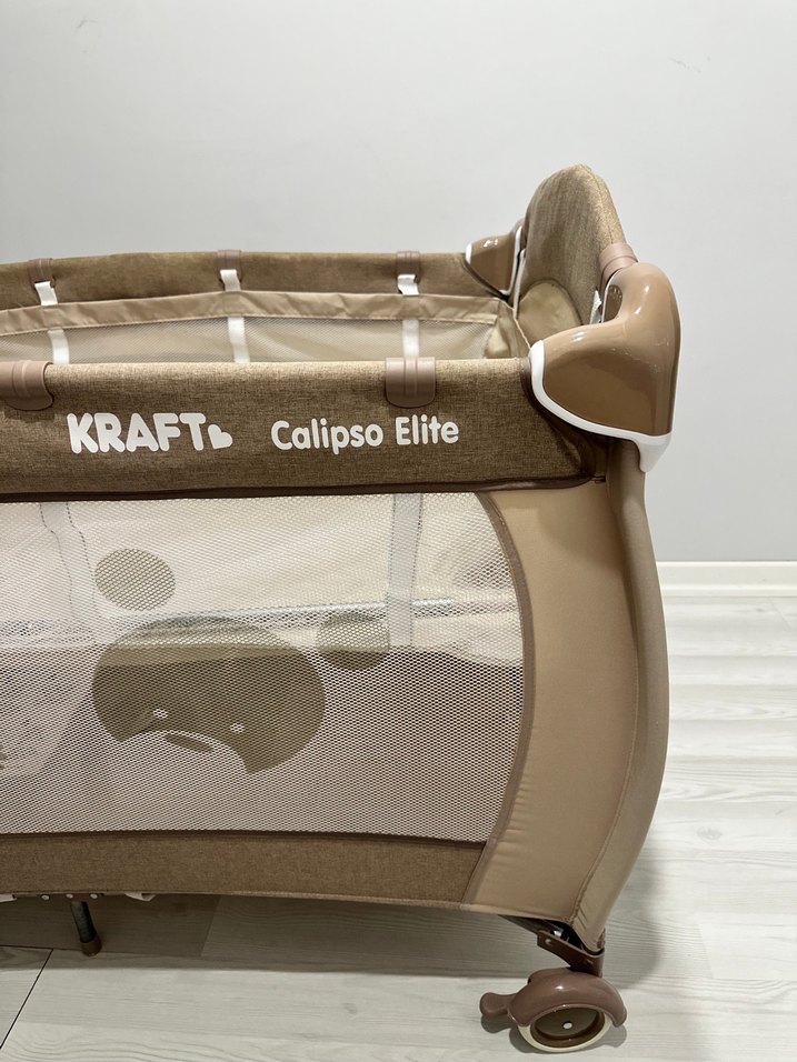 Bej KRAFT Calipso Elite oyun parkı yatağı, file yanlar ve tekerlekleri ile kolay taşınır. Yumuşak kumaş ve sağlam yapı konfor ve güvenlik sağlar. Alt değiştirme alanı mevcuttur. Başlıktaki Işığı ve ninni çaları aktif sorunsuz çalışıyor. Direk resimde görüldüğü gibidir. Taşıma çantası mevcut. Onunla birlikte gönderim yapılacaktır.