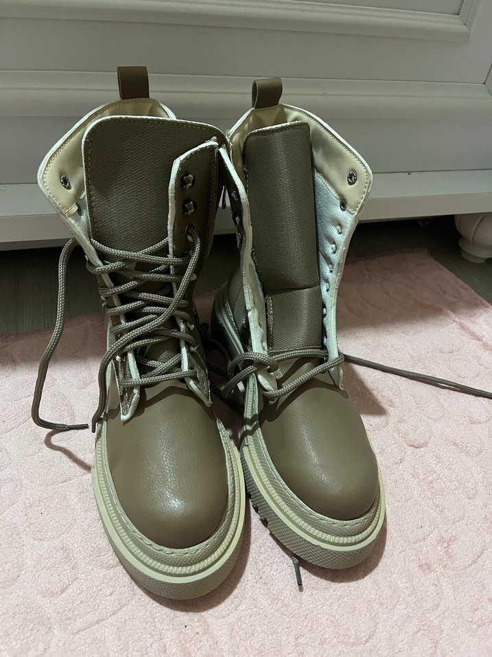 Bej krem deri kadın botlar,topuklu ve bağcıklı, kemerli detaylara sahip. Günlük sokak stili için uygun bot postal