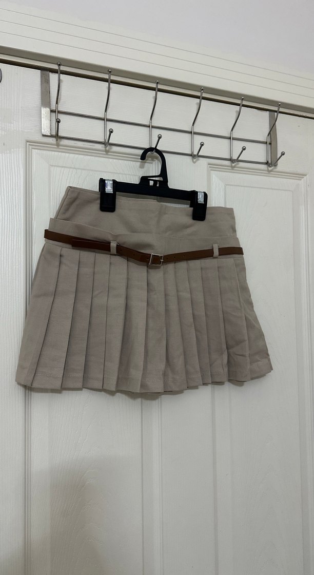 Bej renkte, pilili ve dar kesim mini etek, ince kahverengi kemerle tamamlanmış. Sentetik kumaştan, günlük kullanıma uygun şık sokak tarzı etek.