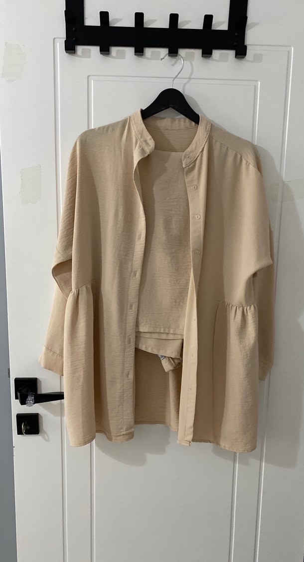 Bej renk krep kumaştan, uzun kollu ve yuvarlak yakalı kadın gömleği. Salaş kesimli üst boy 78 alt boy 100 cm Takım 1 beden s-m beden uyumlu hiçbir kusuru yoktur.