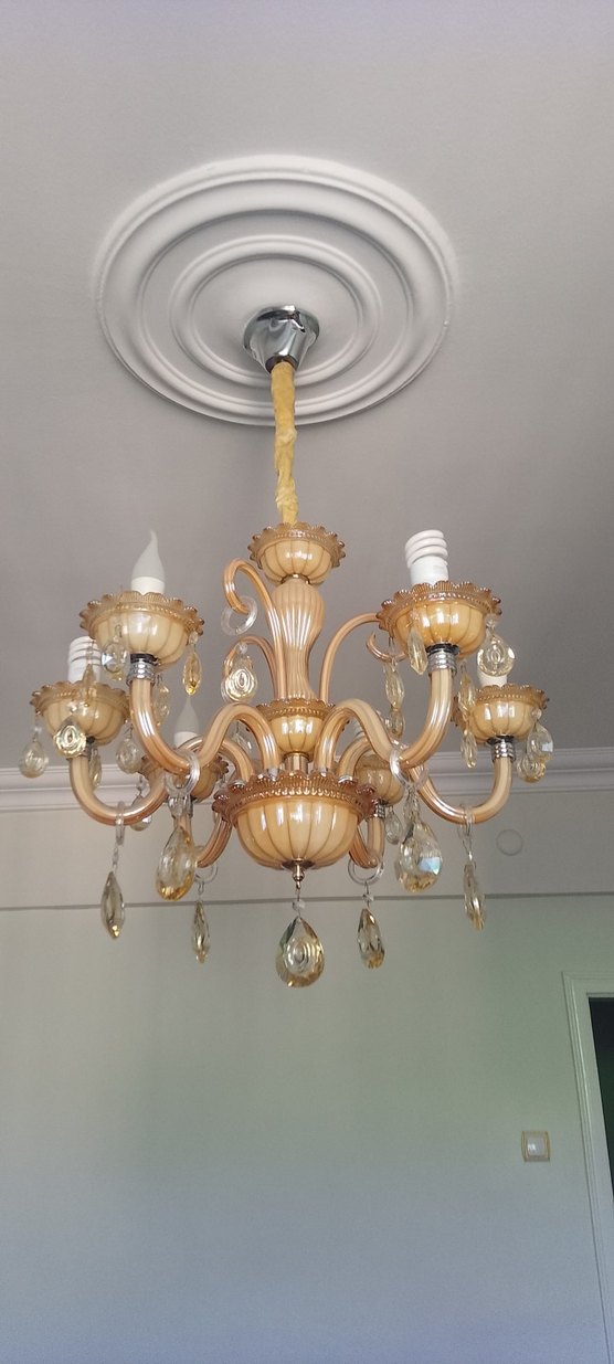 Bej renkte, kristal detaylı altı kollu avize, şık ve zarif bir aydınlatma sunar. Tavan bağlantısı dekoratiftir. Taşınıyoruz diye satıyorum. Herhangi bir sorunu yok. 2 adet fiyatıdır.
