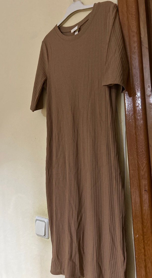 Bej-Kum rengi sentetik kumaştan, kısa kollu, yuvarlak yakalı ve piliseli tasarıma sahip, vücuda oturan uzun elbise. Minimalist ve gündelik şık tarz için uygundur. Hiç giyilmedi. Aynı modelin haki rengi de bulunmakta. Sıfır kusur. (Sipariş kargolanmadan önce tüm ürünler yıkanıp gönderiliyor. Dolaba da yıkanıp kaldırılmıştır. Ütüsüzdür.)