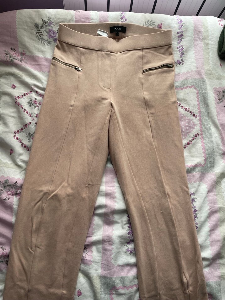 Bej midi uzunlukta, regular fit kadın pantolon, fermuarlı ceplere sahip. Düz sentetik kumaştan üretilmiş, ofis ve günlük sokak tarzına uygun. kaliteli hiç kullanılmadı
