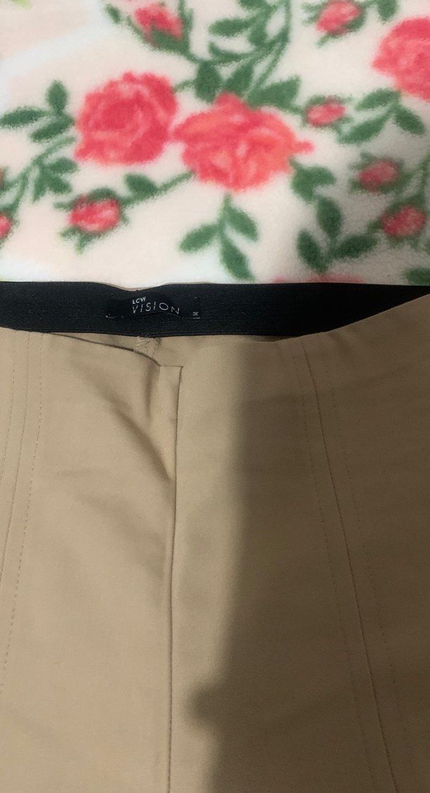 Sentetik kumaştan yapılmış, bej kadın pantolonu. Normal boy ve regular fit kesime sahip, günlük kullanıma uygun sade tasarım.