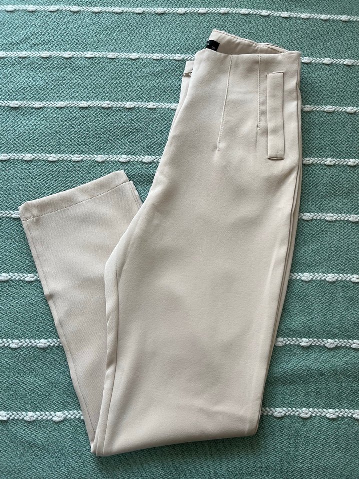 Bej, kadın pantolon. Sentetik kumaştan, fermuarlı detaylı, desensiz ve ofis için uygun.