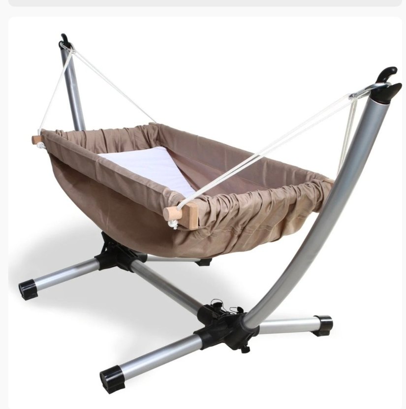 Bej kumaş ve gri metal ayaklara sahip, içinde yumuşak bir yatak bulunan bebek beşiği.