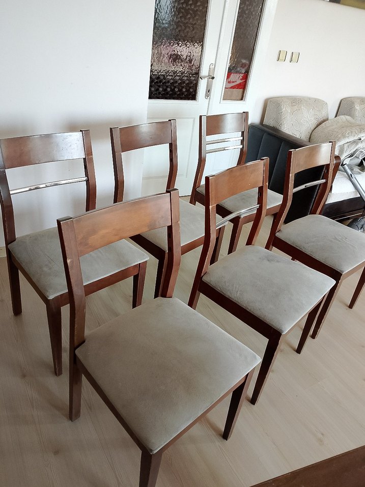Bej kumaş kaplamalı, ahşap çerçeveli klasik tasarımlı sandalye seti. Yemek veya oturma odası için uygun.