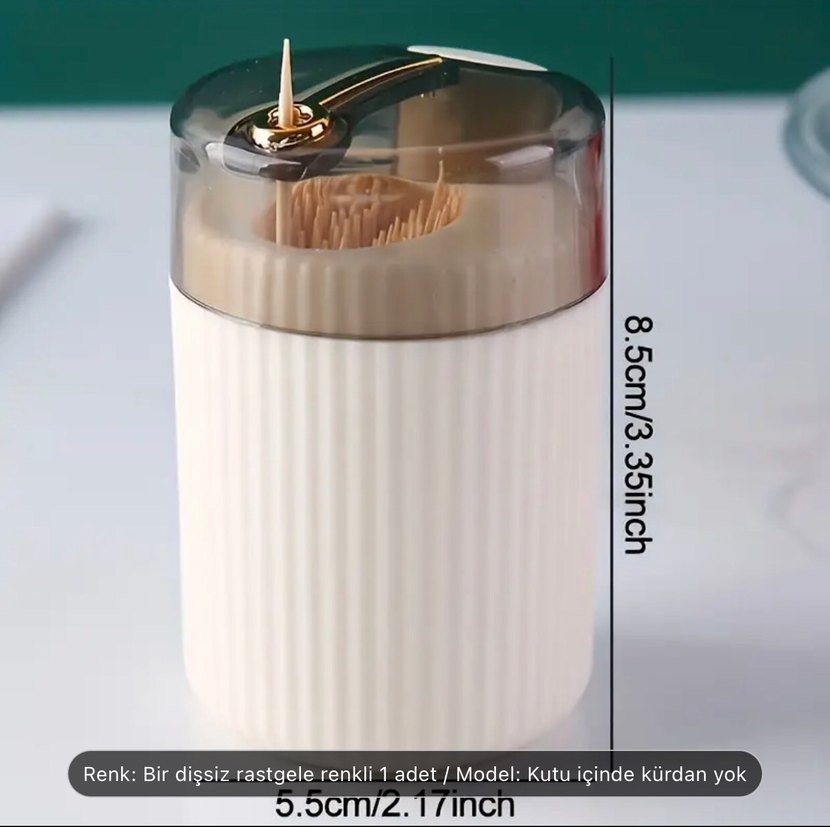Şeffaf kapaklı bej plastik kürdanlık, 8.5x5.5 cm ölçülerinde. Kolay kürdan erişimi için dağıtıcı özelliği bulunur.