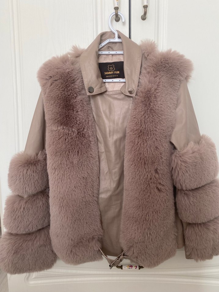 Bej renkli, uzun kollu, kürk detaylı deri kadın mont. Ön ve kol manşetlerinde yumuşak kürk bulunur. Orta uzunlukta, sade ve şık model.