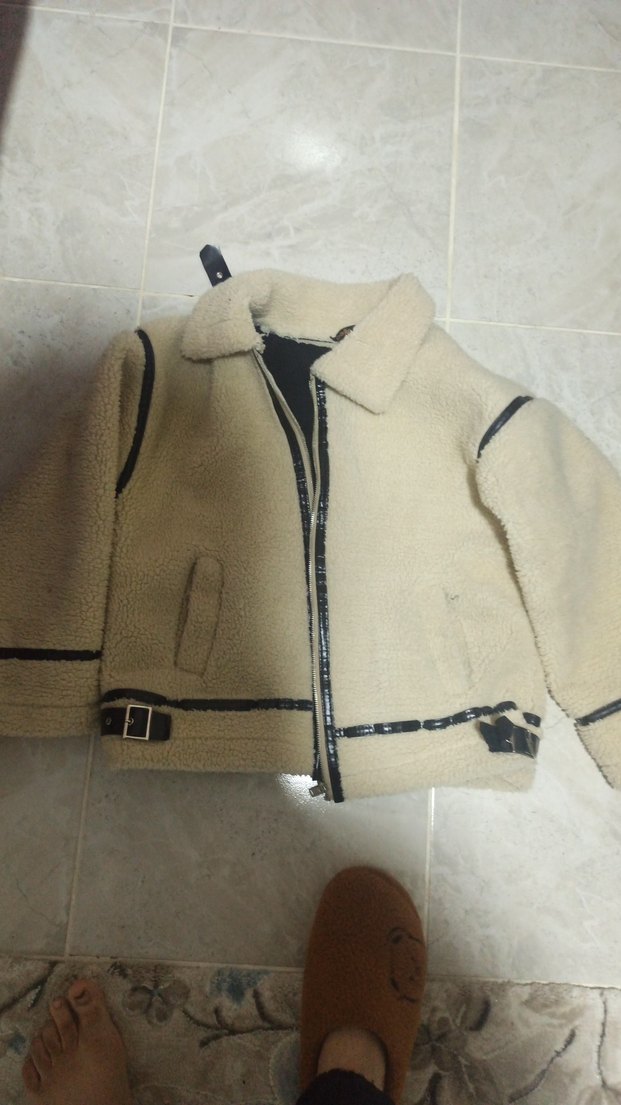 Bej renkli, kürk detaylı ve yumuşak dokulu, uzun kollu, normal midi boyda, dar kesim kadın cekettir.