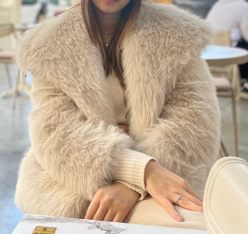 Bej renkte, yumuşak yün kumaştan yapılmış, kürk detaylı, kesimi vücuda oturan, notlu yaka ve uzun kollu boy kadın kaban. ❄️