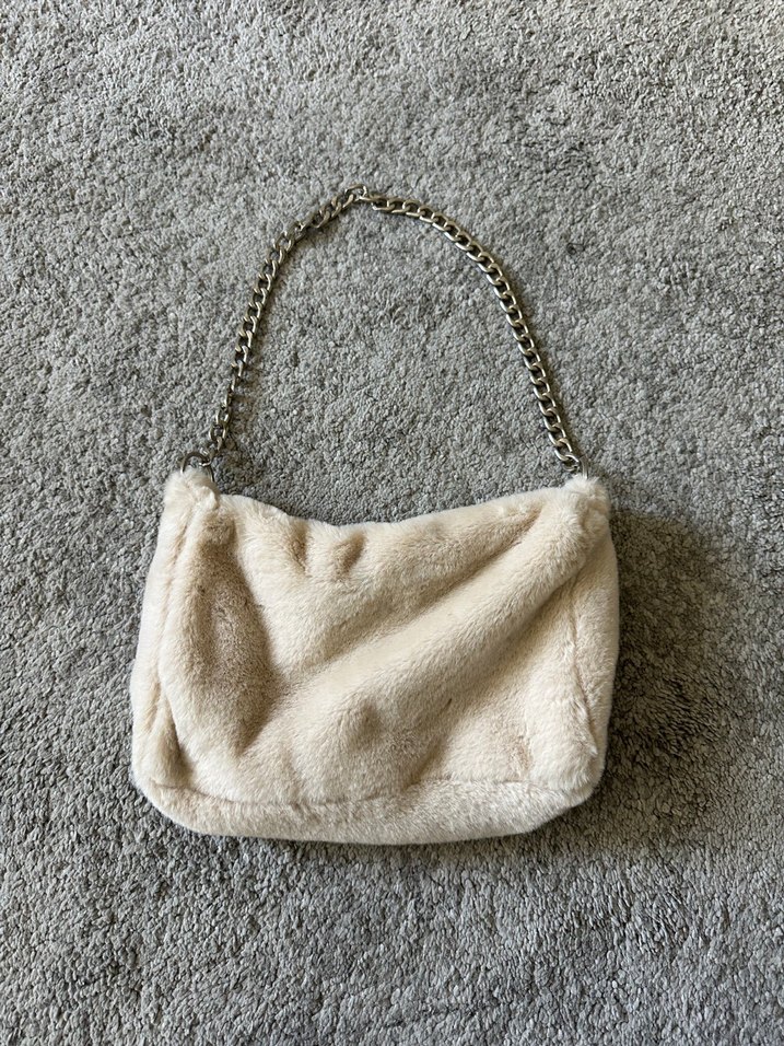 Yumuşak kürk detaylı, metal zincir saplı bej kadın omuz çantası, günlük kullanıma uygun hiç kullanılmadı