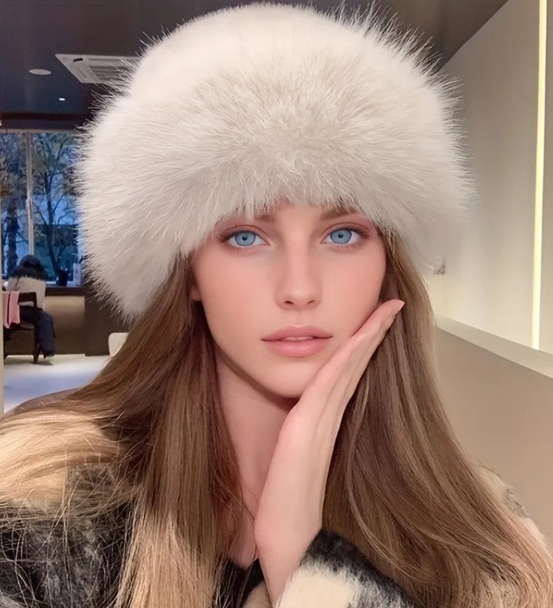 Bu kadın şapkası, yumuşak beyaz yün ve kürk detaylarıyla sıcaklık ve cesur, karşı kültür stilini bir araya getiriyor.