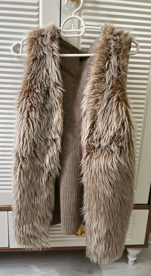 Bej renkte, kürk detaylı, yün kumaştan yapılmış, kolsuz, normal uzunlukta ve kesimli bohem tarzda kadın yeleği.38-40 beden uyumludur