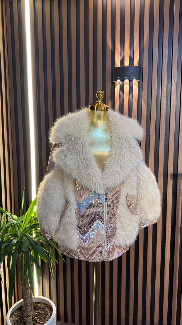 İtal bej renkli, uzun kollu ve kürk detaylı kısa mini ceket. İşlemeli desenleriyle bohem ve şık bir görünüm sunar. Parti için uygun, rahat kesim.
