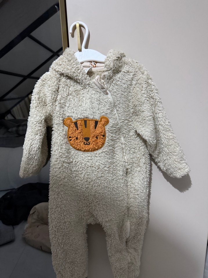 Kürk detaylı, leopar desenli yumuşak ve sıcak bej bebek tulumu. Önünde sevimli bir kaplan yüzü bulunur. Deformesi yok az kullanıldı temiz. 12-18 ay kız ve erkek için uygundur