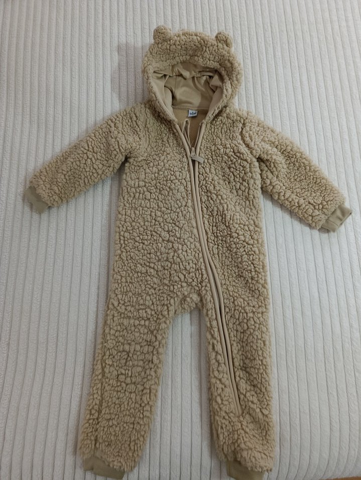 Yumuşak, kürklü kumaşa sahip bej bebek tulumu, kapüşonunda ayıcık kulakları bulunur ve bebeğinizi sıcak tutar.