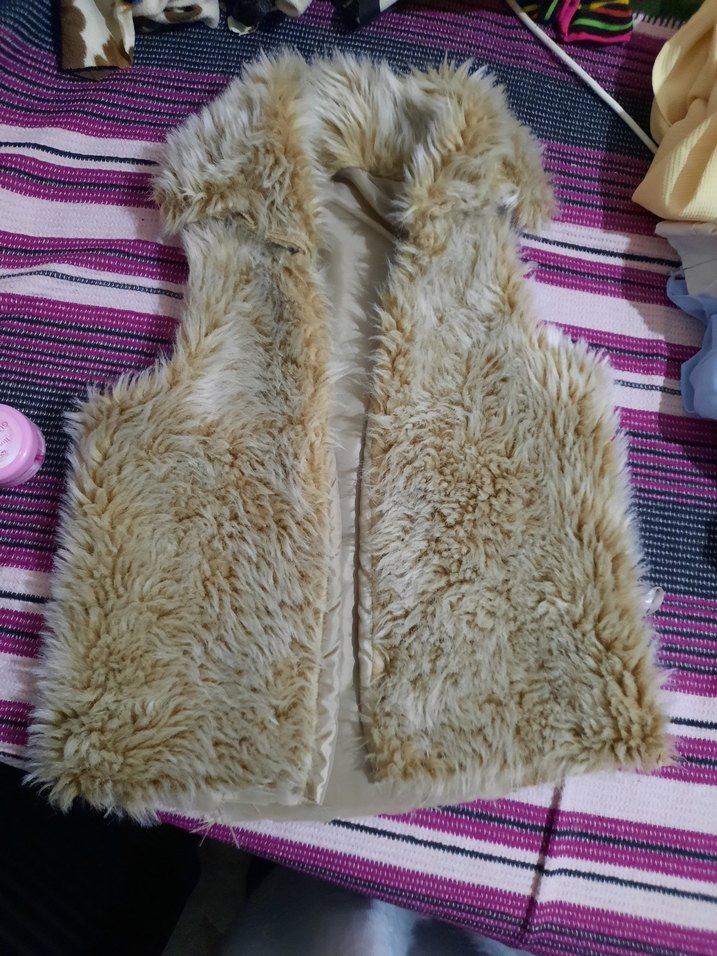 fotoğrafta görüldüğü gibi alt kısmı dikilecek birde yaka arka kısmı elde de dikilir yumuşakcık. iade yoktur ölçü verilir Bej renkli, kürklü detaylı, kolsuz ve straplez yakalı kadın yelek. Bohem stilinde, rahat ve yumuşak dokulu, günlük kullanıma uygun.