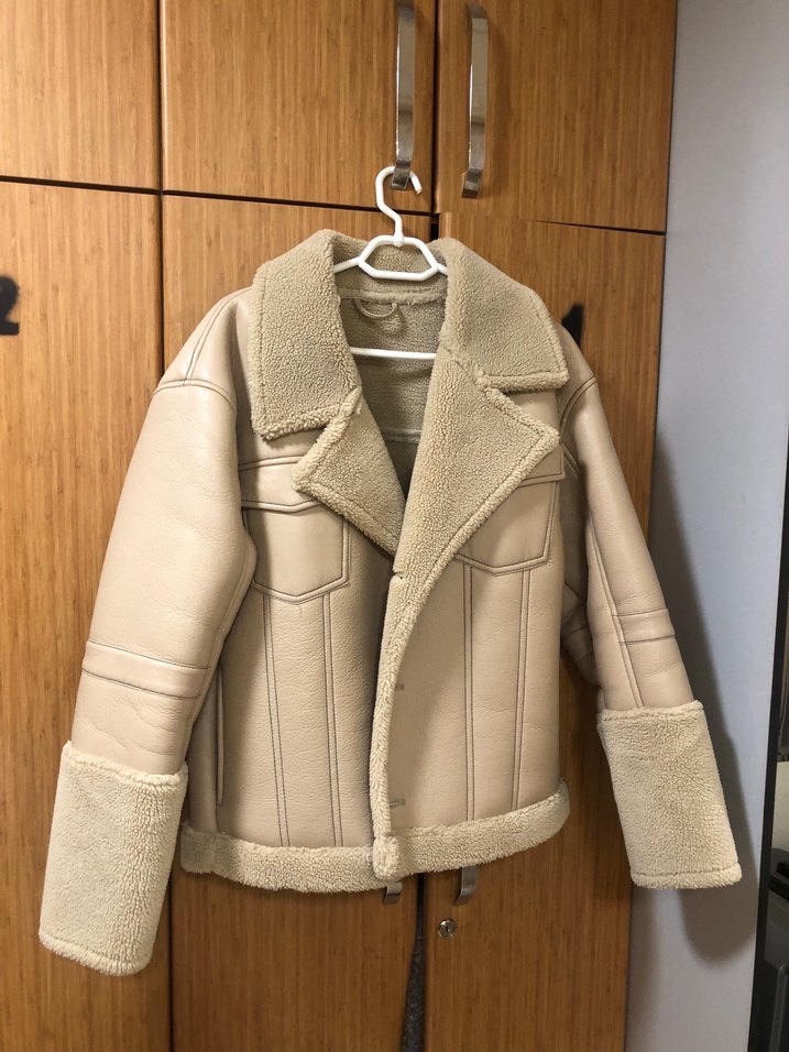 Bej deri ceket, yaka, manşet ve etek kısmında kürk detaylarıyla rahat ve trend bir görünüm sunar. Normal boy, regular fit ve kesik yakalıdır. Fotoğrafta görüldüğü gibi