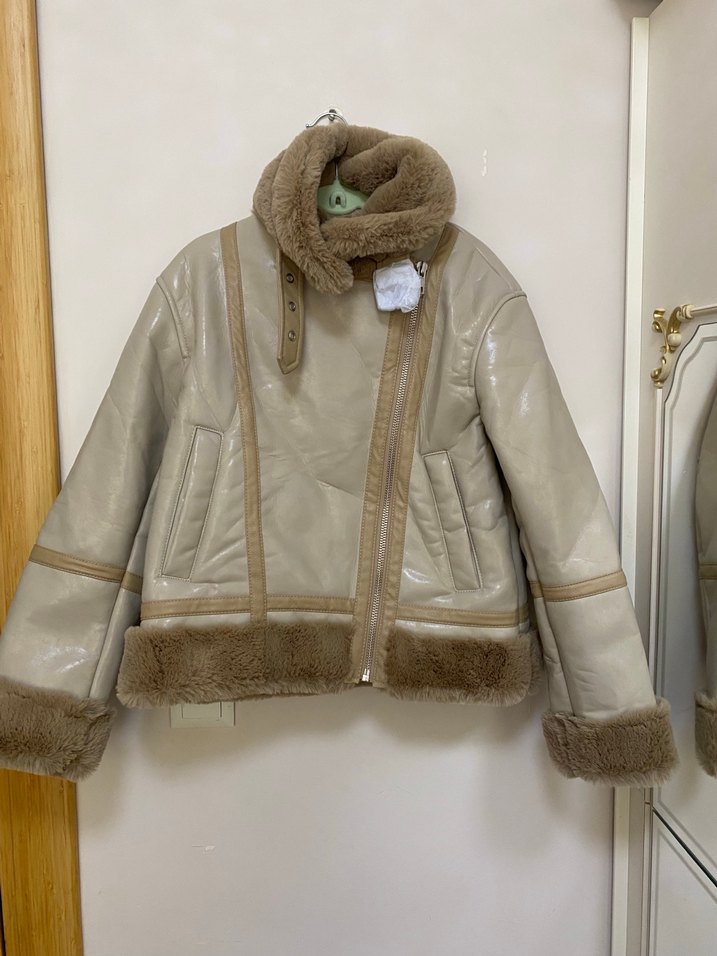 Bej renkli deri kadın ceket, kürk detaylıdır. Normal boyda, fitted kesim ve notched lapel yakaya sahiptir. Strappy kolludur, sokak stiline uygundur. Kusurunu belli ettim ufak bir kısmının ipi söküldü