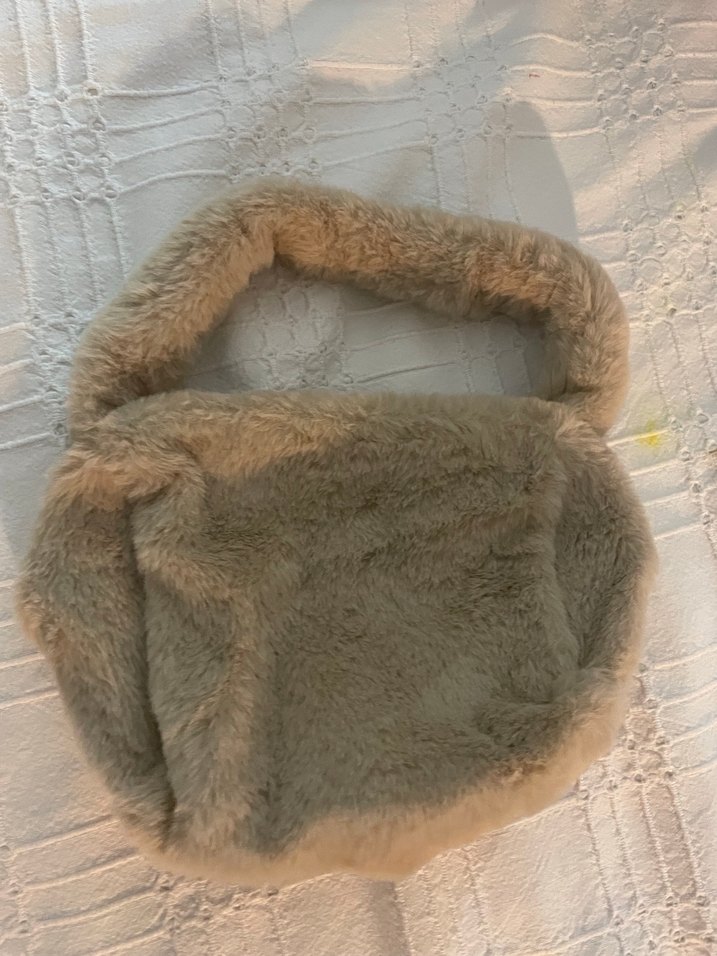 Bej renkte, yumuşak ve sıcak kumaştan yapılmış, kürk detaylı kadın çantasıdır. Sade ve desensiz tasarımıyla günlük kullanıma uygundur.
