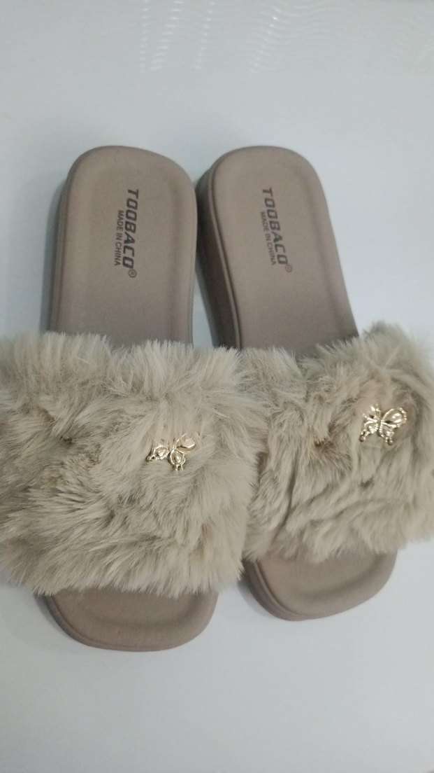 Bej renginde, yumuşak kürk detaylı ve dolgu topuklu kadın terliği. Nakışlı kelebek süslemeleri ve rahat yünlü tabanıyla günlük kullanıma uygun. Marka: TOOBACO.