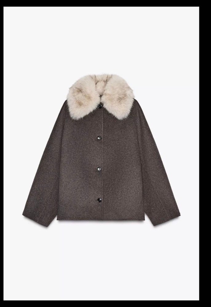 Bej kürklü yakaya sahip, yün kumaştan yapılmış, normal kesim ve midi uzunlukta gri kadın kaban. Uzun kollu ve desensiz, günlük kullanıma uygun.