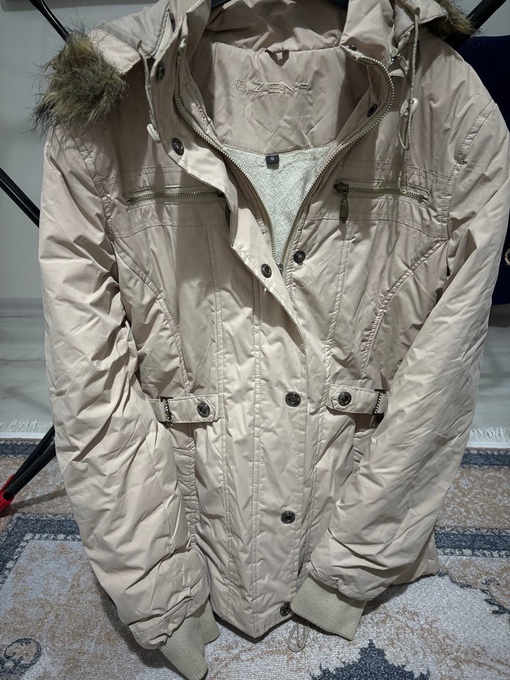 Bej renkli, kürk detaylı ve kesimli kadın kışlık ceket. Uzun kollu, normal uzunlukta, yumuşak sentetik kumaştan üretilmiştir. Sokak stiline uygun bir dış giyim ürünü. ❄️ Kürkü çikarılabilir