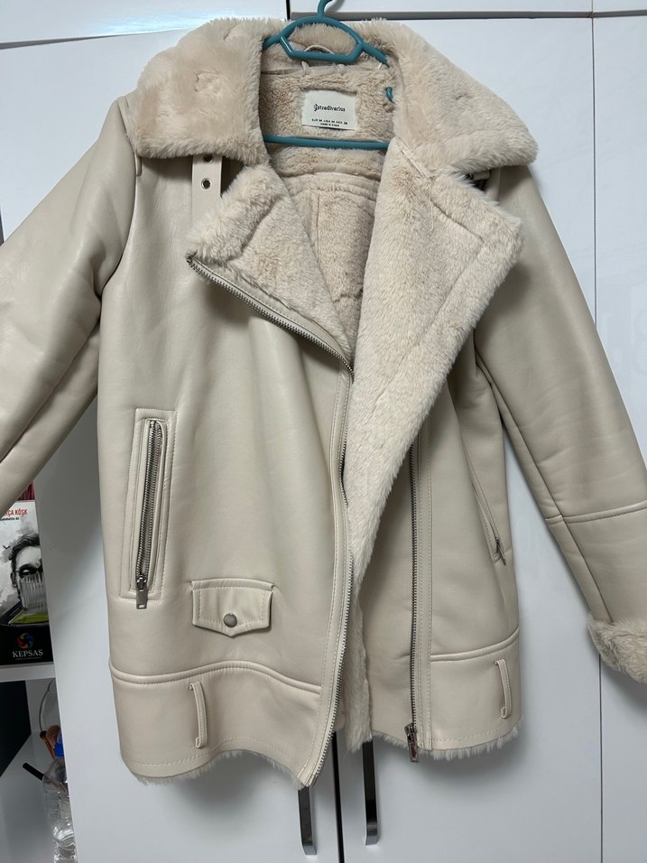 Bej renkli, kürk detaylı, yumuşak fleece astarlı, fitted kesim kadın kışlık mont. Uzun kollu ve normal midi boyda, günlük sokak stili için uygundur.