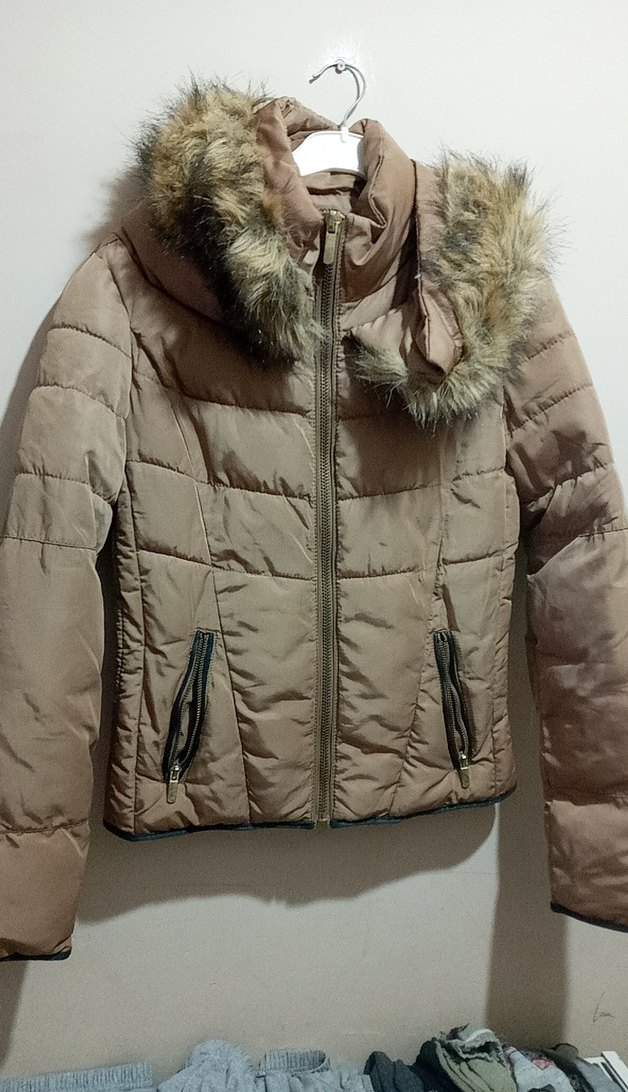Bej renkli, kürklü detaylı, kesimi dar kadın kışlık mont. Yumuşak sentetik kumaştan, trend sokak stili için uygundur. ❄️