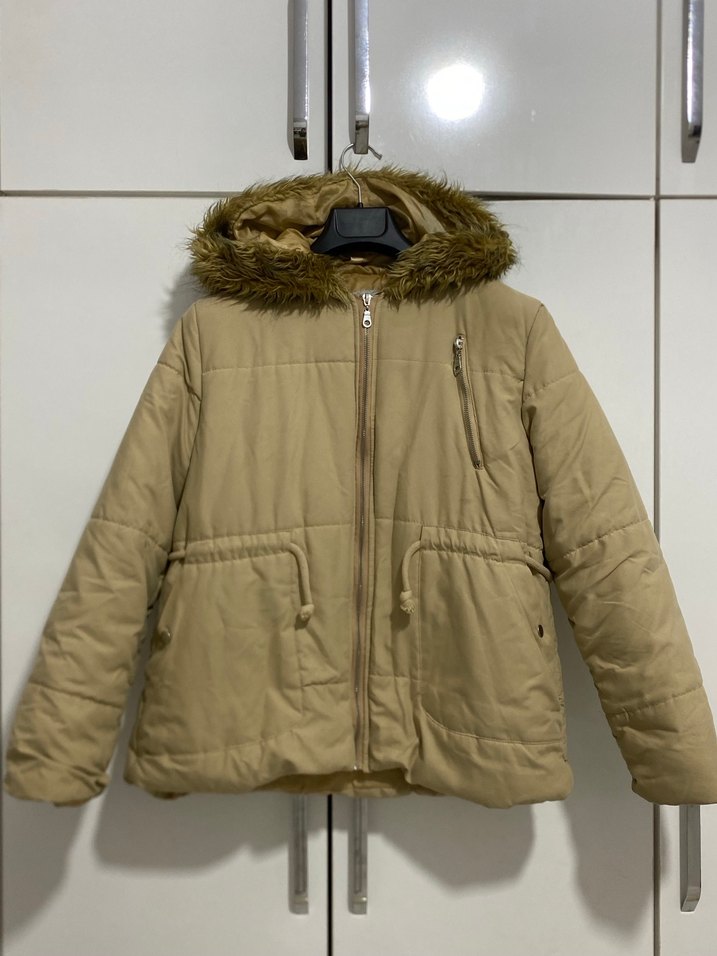 Bej renkli, kapüşonunda kürk detaylı, oturmalı kesime sahip kadın kışlık mont. Fermuarlı ve cepli, rahat sokak stili için uygun.