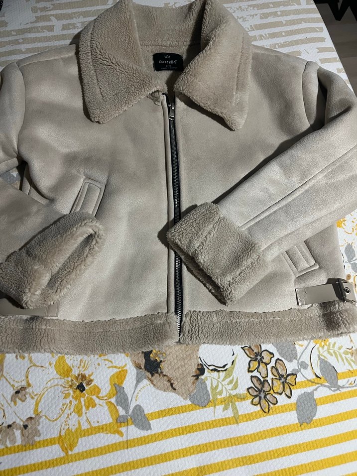 Bej renkte, kürklü detaylı, uzun kol kadın ceketi. Sıcak ve yumuşak dokusuyla günlük rahat kullanım için uygundur.