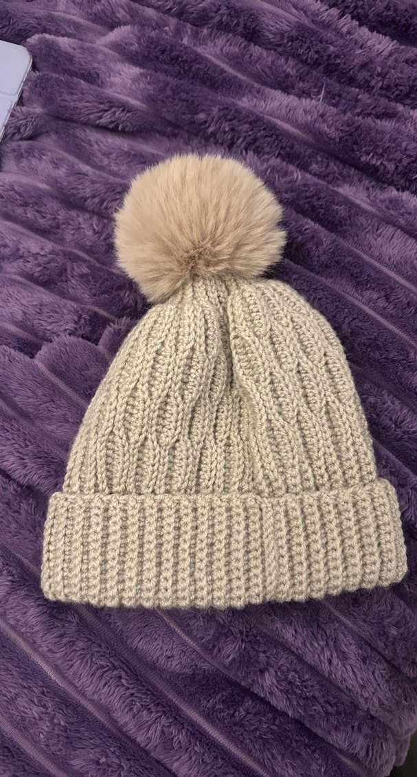 Üstü yumuşak kürk ponponlu bej örgü bere, rahat ve sade bir tarz sunar. Günlük kullanıma uygun. ❄️