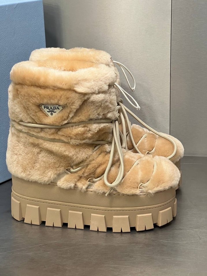 Bej renkte, yumuşak kürk detaylı ve konforlu kürk astarlı platform topuklu botlar. Sokak modasına uygun, günlük kullanım için idealdir. Prada ️İthal ürün & imported 36-37-38-39-40-41