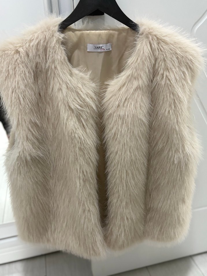 Yumuşak kürklü detaylara sahip bej renkli, kolsuz, v yaka, vücuda oturan kadın yeleği. Rahat ve şık sokak stili için uygun.