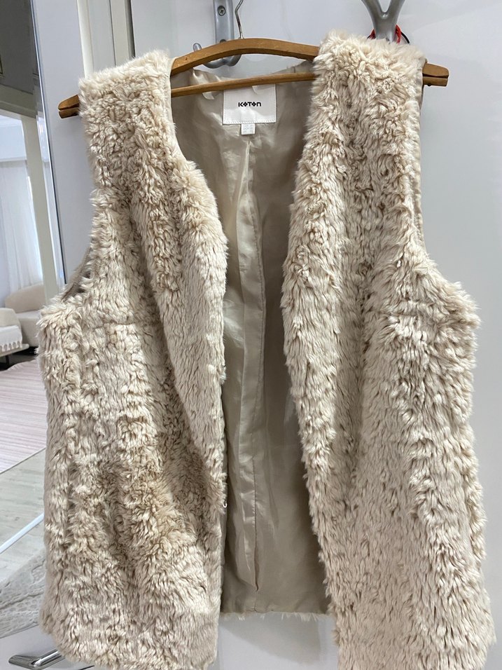Bej renkte, kürk detaylı, kolsuz ve normal boyda kadın yelek. Fitted kesim ve yakası notched lapel tarzında,