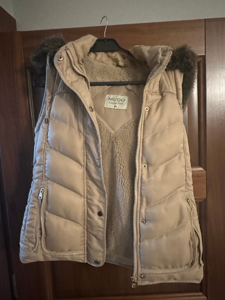 Mudo markalı, bej renkli, kürklü ve yakası kesimli, kolsuz kadın yelek. Yumuşak ve sıcak kumaştan, midi boyda, rahat ve şık sokak stili için uygun.