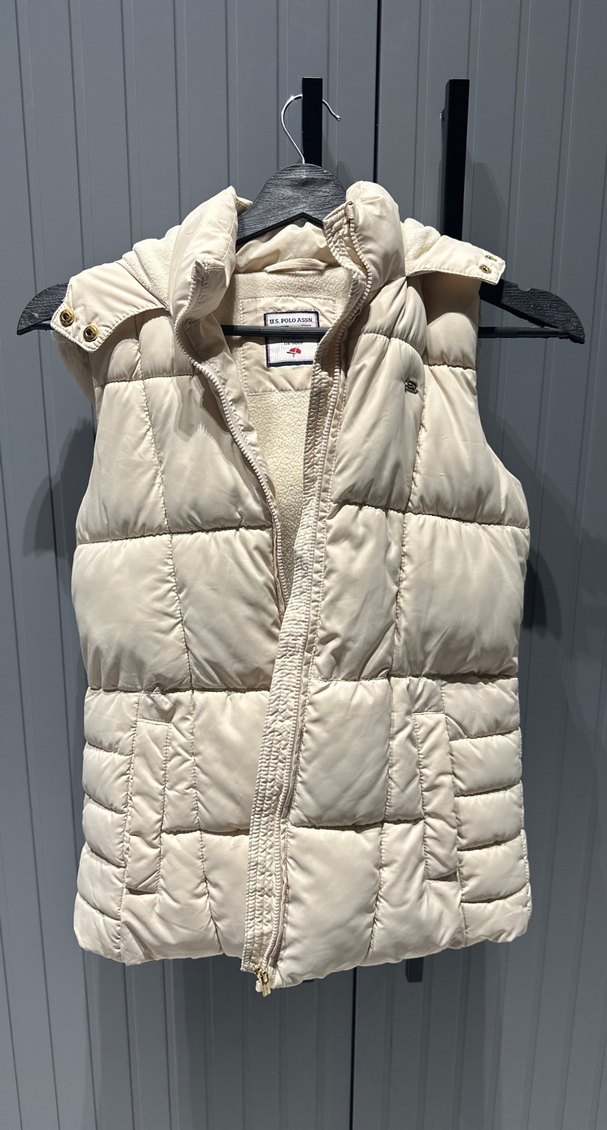 Yüksek yakalı, kürklü detaylı, bej renkte, yumuşak ve sıcak kumaştan yapılmış, kolu olmayan, midi uzunlukta, dar kesim kadın yelek.