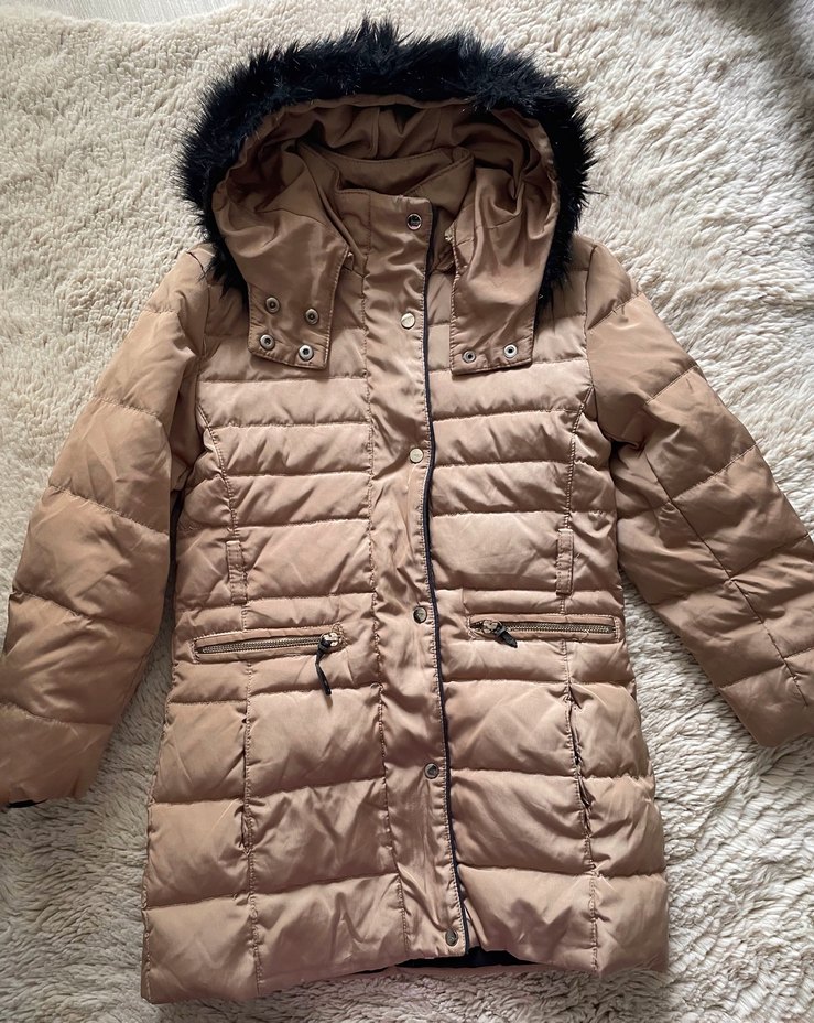 Bej renkli, kürklü kapüşonlu, sentetik kumaştır.