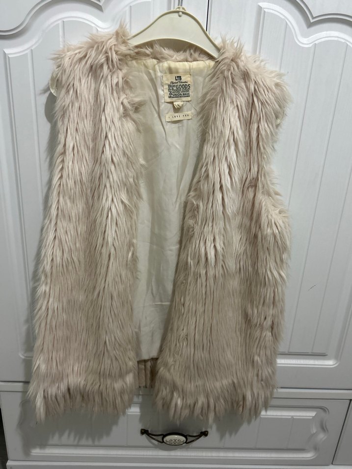 Bej renkli, kürklü detaylı, kolsuz ve vücuda oturan kadın yelek. Yumuşak sentetik kumaştan yapılmış, normal midi boyda, günlük kullanıma uygun bohem tarzda.