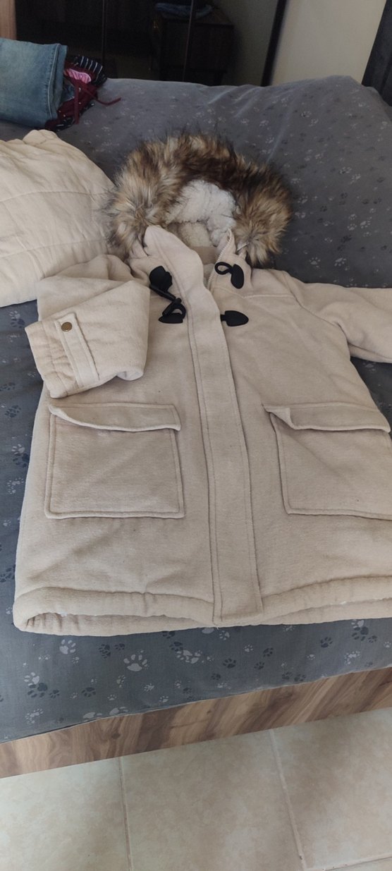 Bej renkli, kürklü detaylı kapüşonlu kaban. Uzun kollu, normal boyda ve yumuşak, sıcak kumaştan üretilmiştir.