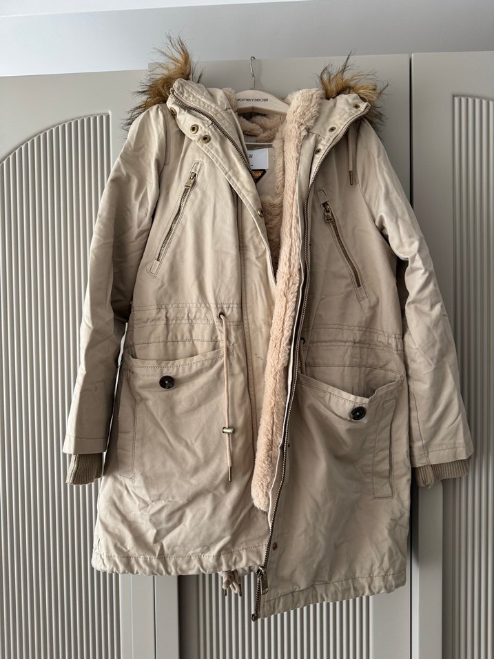 Bej pamuklu ceket, kürklü kapüşon ve kesimli yakaya sahiptir. Midi boy, regular fit ve askılı kolludur. Sokak stiline uygun, çok cepli ve içi sıcak tutan astarlı bir modeldir içindeki kürk cıkmaktadır mevsimlikte kullanılabilen ceket oluyor kuru temizleme yapılması gerekir